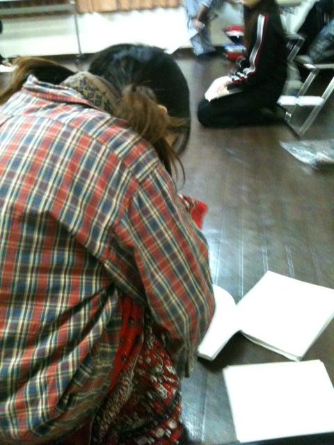 台本の確認をしている寺本奈央の後ろ姿。